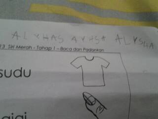 1st time tgk dia tulis nama sendiri tanpa bantuan.Memula tulis ALYHAS....sy cakap salah bunyinya...then dia cuba lagi, dah jadi AYHSA pulak.....(sy duk khusyuk layan TV time tuh...isk!).....tetiba dia cakap 'Ummi...ini betul tak?'.....wahhh...dah pandai anak Ummi rupanya.....Mesti belajar kt tadika nih